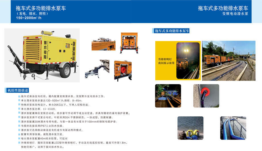 牵引式柴油发电机组,箱内配置变频潜水泵,实现野外发电排水工作;特殊的泵体结构设计,单台35KG以下,可单人轻松抬起;流量大、体积小、重量轻、携带方便;主要用于防汛抢险、防旱灌溉和排涝等突发险情的场合;适用于雨水、轻度污水;便携式永磁变频潜水泵可应用在排涝、抗旱、应急排水抢险、市政工程临时积水、江河水库应急调水、消防应急排水、应急抽排水等,对基础设施要求简单,可实施远程救援。
