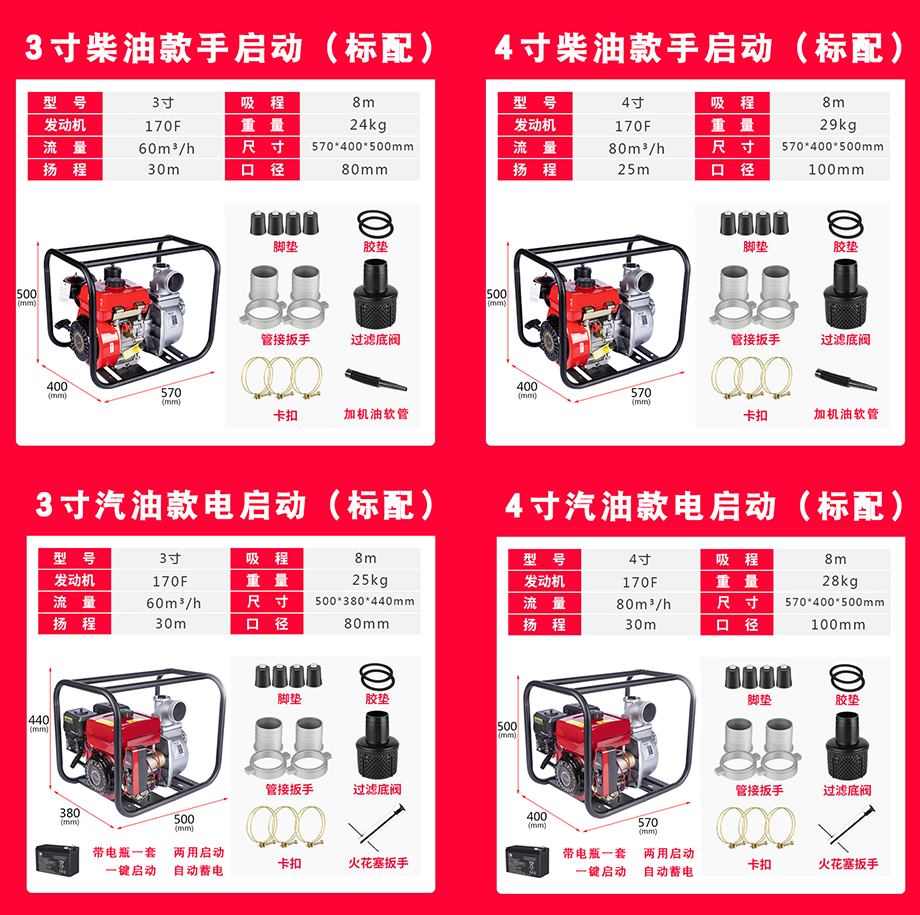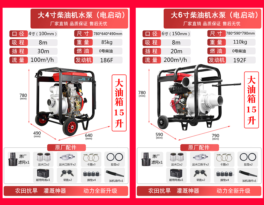 柴油机水泵:农田抗旱、灌溉神器;动力全新升级;污物通过能力好,抗缠绕堵塞。